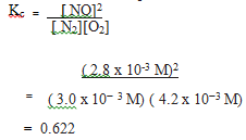 At equilibrium, the concentrations of N2=3.0 × 10–3 M, O2= 4.2 × 10–3M and NO= 2.8 × 10–3 M in a sealed vessel at 800K. What will be Kc for the reaction N2(g) + O2(g) <=> 2NO(g)