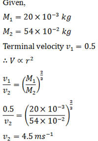 An iron sphere of mass 20 × 10-3 kg falls through a viscous liquid with terminal velocity 0.5 ms-1 . The terminal velocity (in ms-1) of another iron sphere of mass 54 × 10-2 kg is